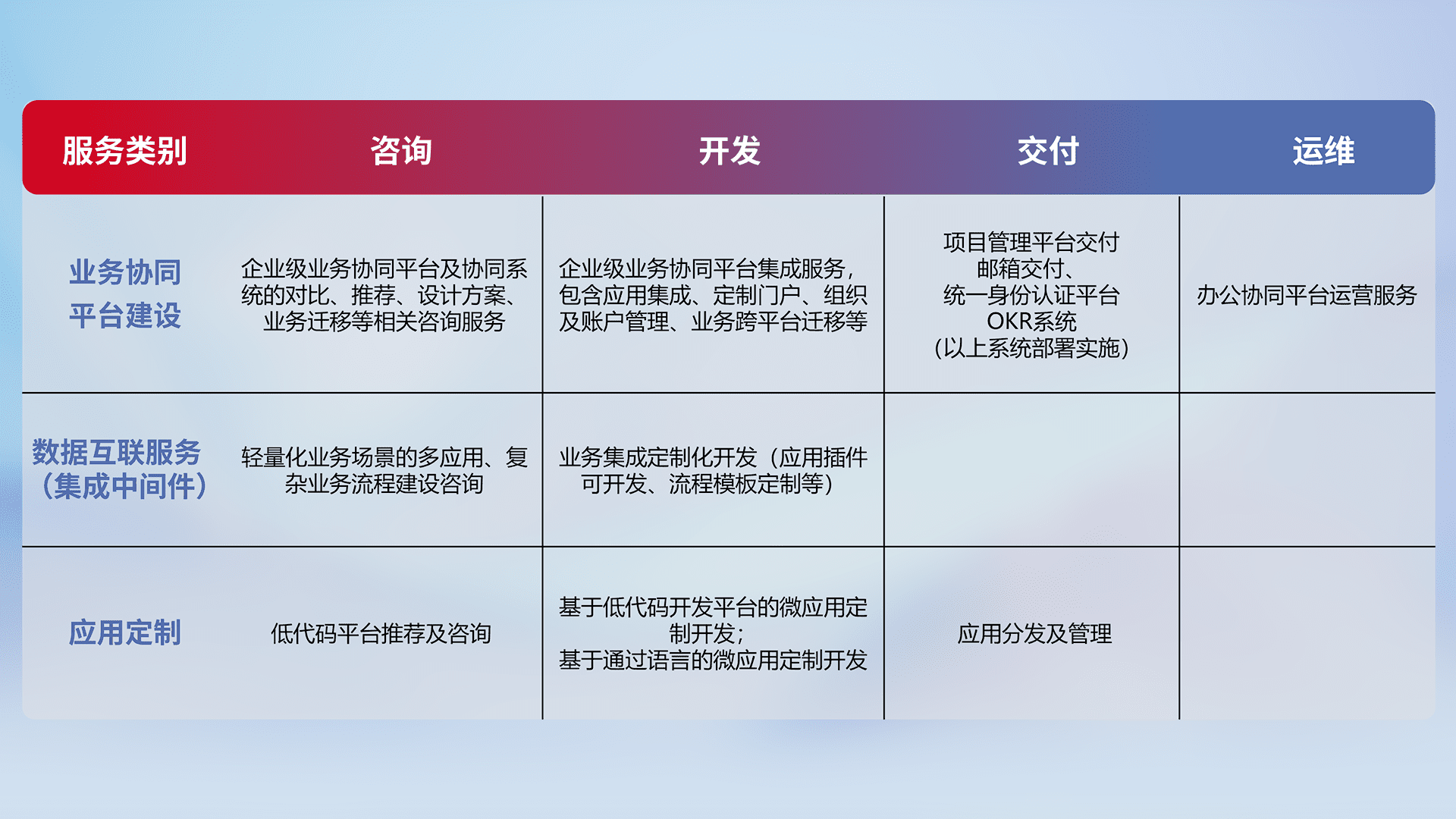 针对钉钉、、企微、、、、IDaas等平台级产品提供产品的规划、、、方案、、交付、、定制化开发等服务,,实现如统一协同办公、、、智能客户服务、、混合会议管理、、智能数据查询、、等业务场景,,实现数字化转型。。。