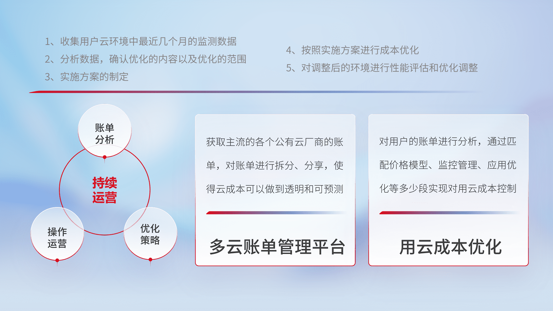 通过多云纳管,,以统一的资源数据模型把客户的云资源进行抽象和封装,,,,进而实现对多云资源的统一操作,,保障云资源管理的可靠性、、、稳定性与可用性。。量身定制化运维内容,,配置、、、、开发运维、、补丁管理、、备份、、、监控、、、认证和访问管理、、、审计和日常巡检等,,,保障在用云过程中的可靠度,,稳定度以及高可用率。。。。