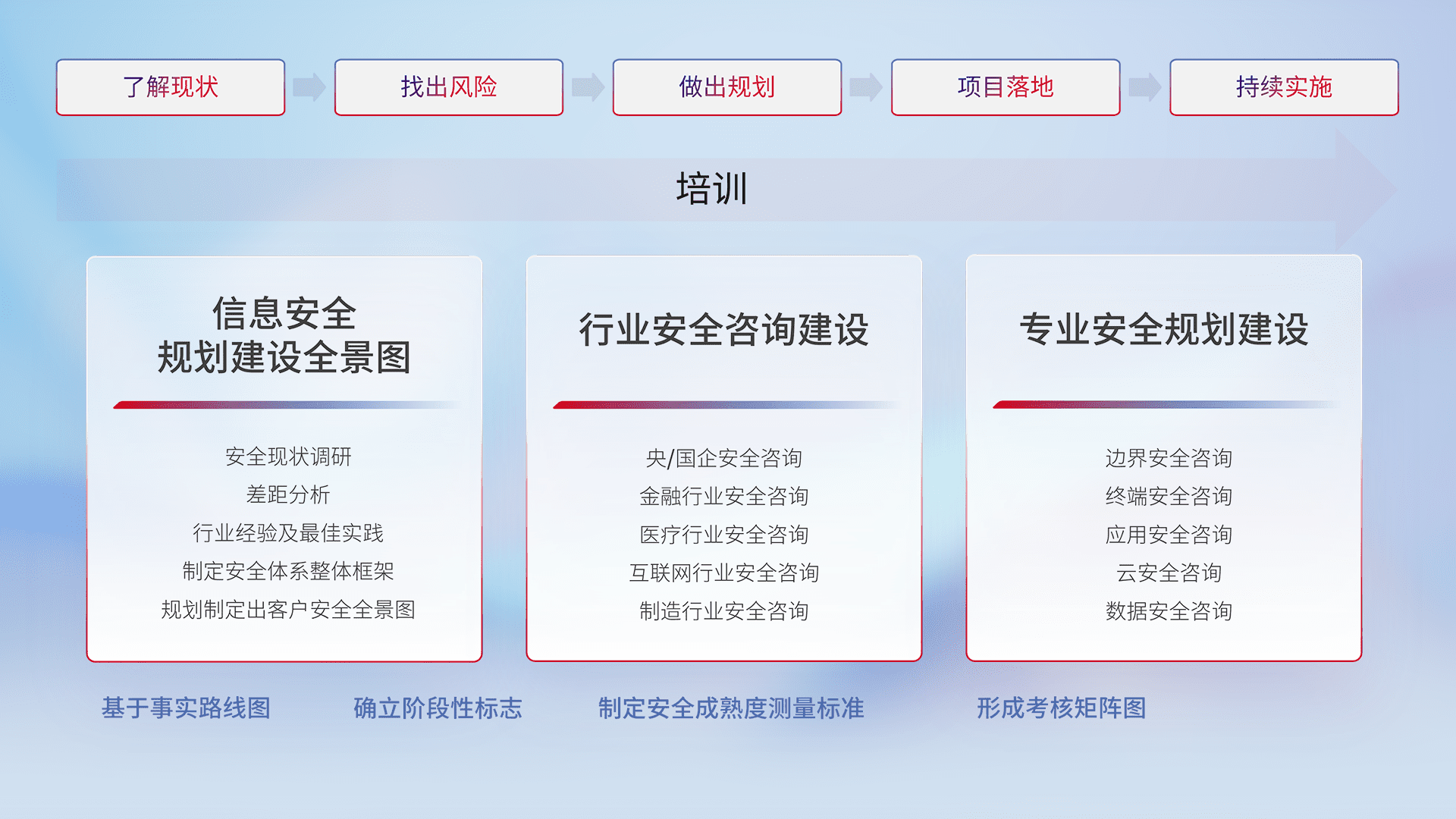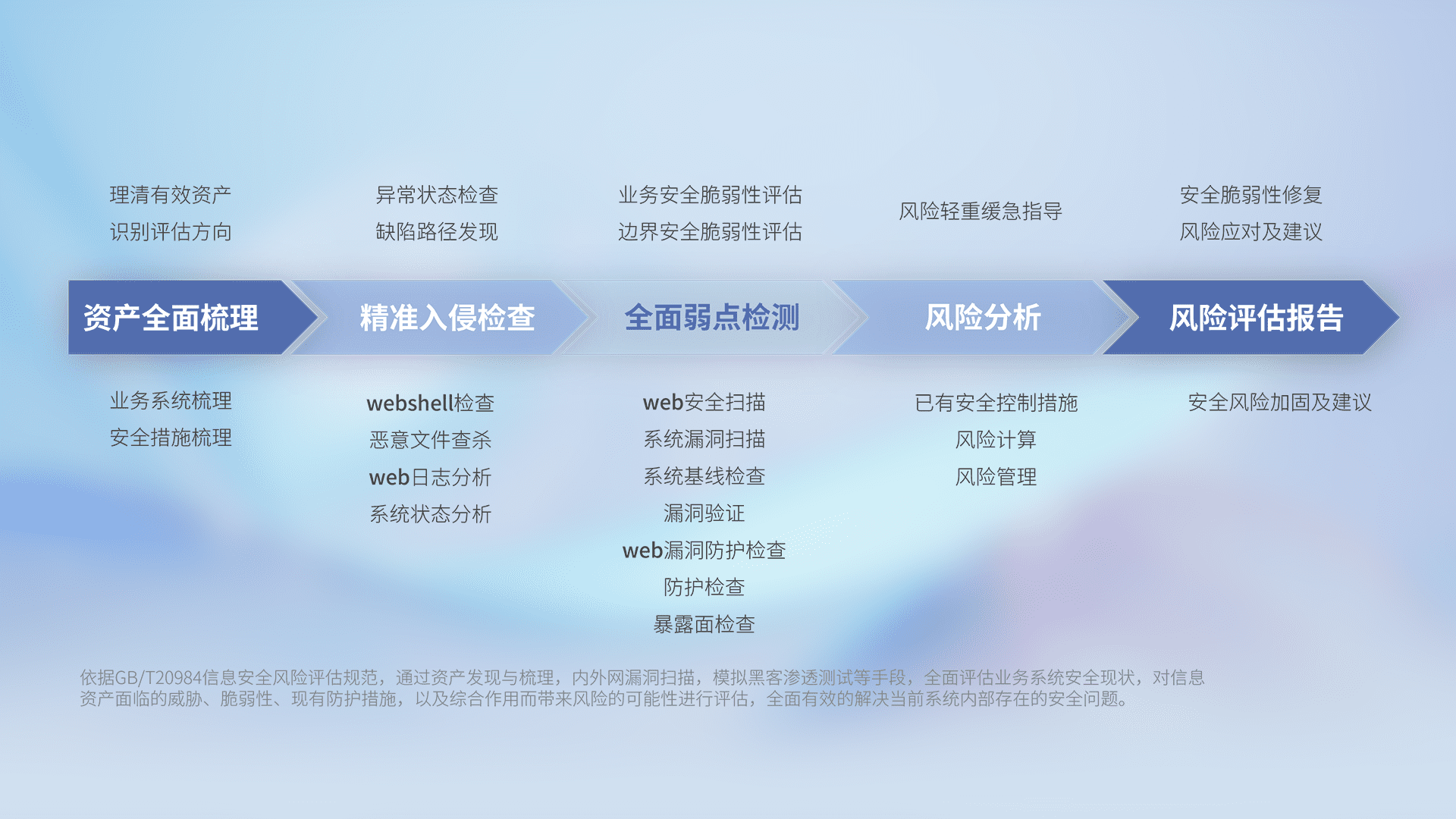 针对客户行业特性,,,,以专业的安全服务+多厂商联合解决方案提供专属的一站式安全管理服务,,帮助客户全面感知网络空间威胁,,,,基于识别、、、、检测、、、分析、、防护、、、监测、、响应的服务理论模型,,,,从方案咨询、、集成交付、、、评估验证、、、、优化加固、、、运维运营,,,致力于为客户提供完整的闭环管理式安全服务。。。以实战经验为客户打造高抵御风险的安全体系,,,,帮助客户发现威胁、、、、对抗威胁、、处置威胁,,不断积累安全对抗能力,,,持续保障数字化安全。。。